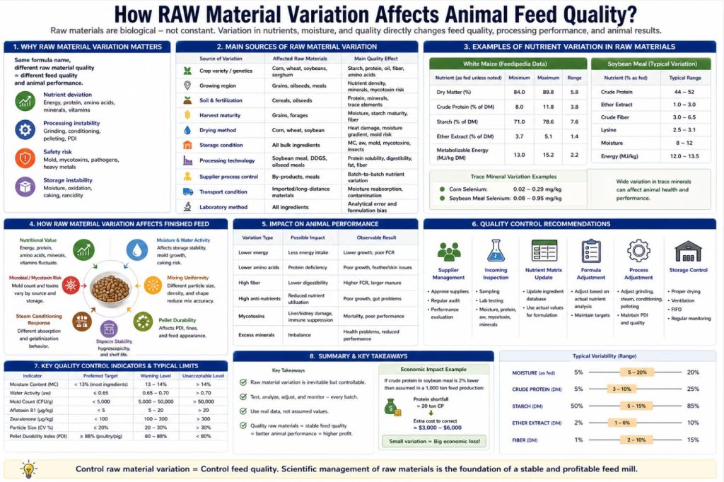 Raw material variation affects animal feed quality through nutrition, processing, safety, and storage stability. A feed formula may appear correct on paper, but if incoming ingredients differ from the assumed matrix, the finished feed may fail in crude protein, digestible amino acids, energy, pellet durability, moisture stability, or microbial safety.